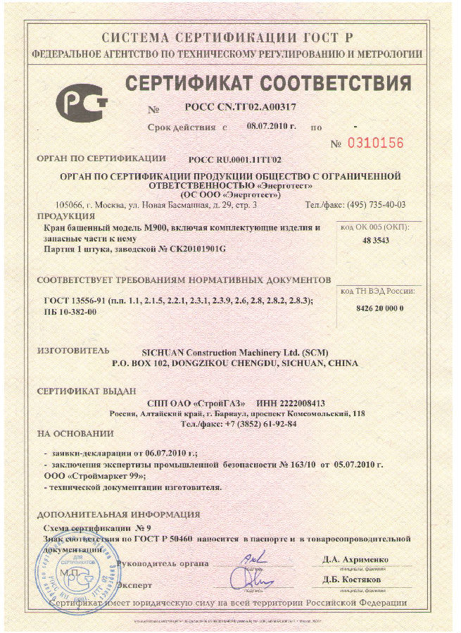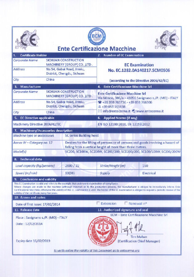 順利通過ISO9001國際質量體系認證,體系覆蓋產品:塔機、施工梯、混凝土攪拌機、膠印機系列產品;