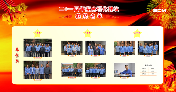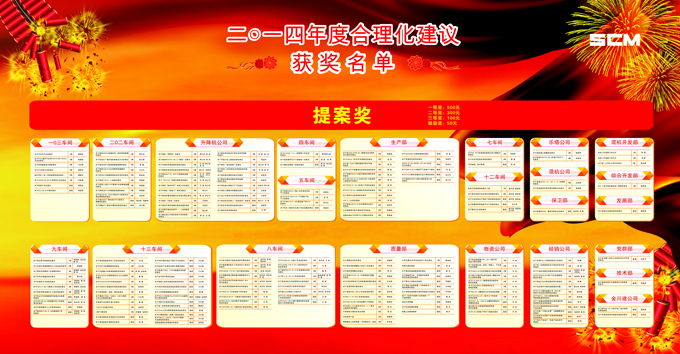 2014年期間,(集團)公司共收到合理化建議238條,其中170條被公司采納,為了鼓勵員工積極參與合理化建議活動,公司對2014年度的合理化建議活動進行評比表彰,經討論評定評選出單位一等獎2名,二等獎4名,三等獎3名,提案一等獎2個、二等獎9個、三等獎135個、鼓勵獎70個,予以表彰。
