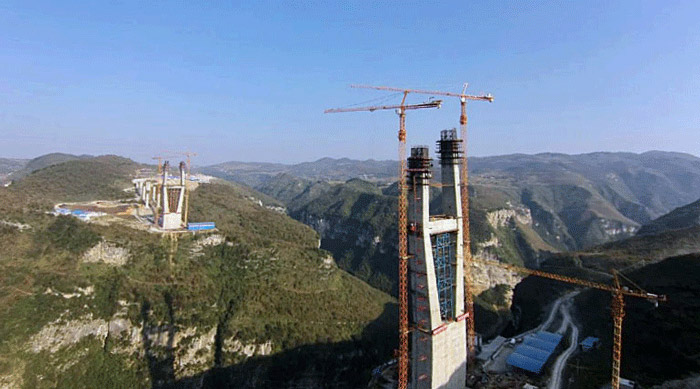 項目地點:六廣河特大橋是息黔高速公路最為重要,同時也是施工難度最大的控制性工程,兩側橋墩高度均為242米,每個橋墩的起重機械配置均為川建生產的兩臺C7030塔機和兩臺SC200/200WPZ中速變頻施工梯。